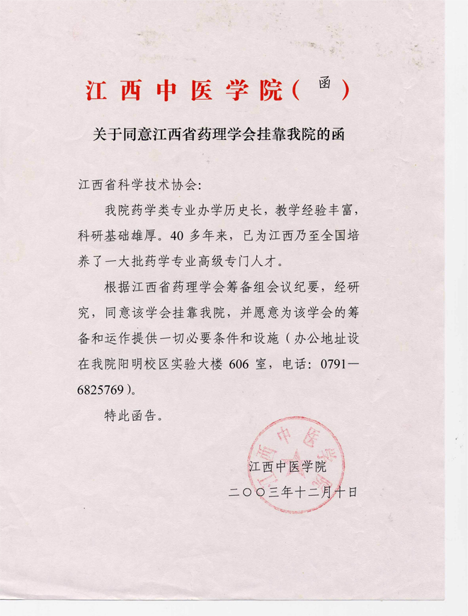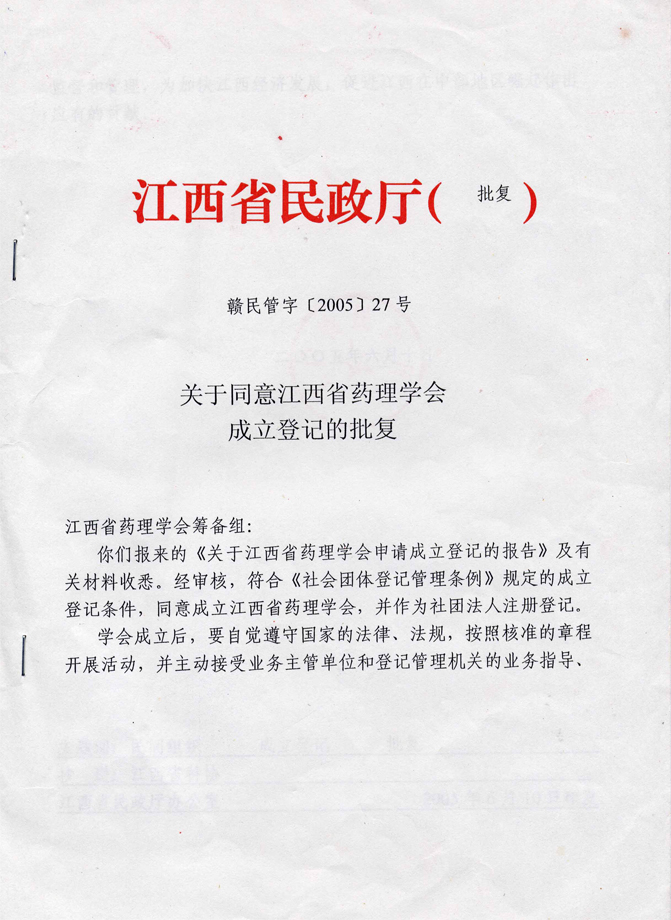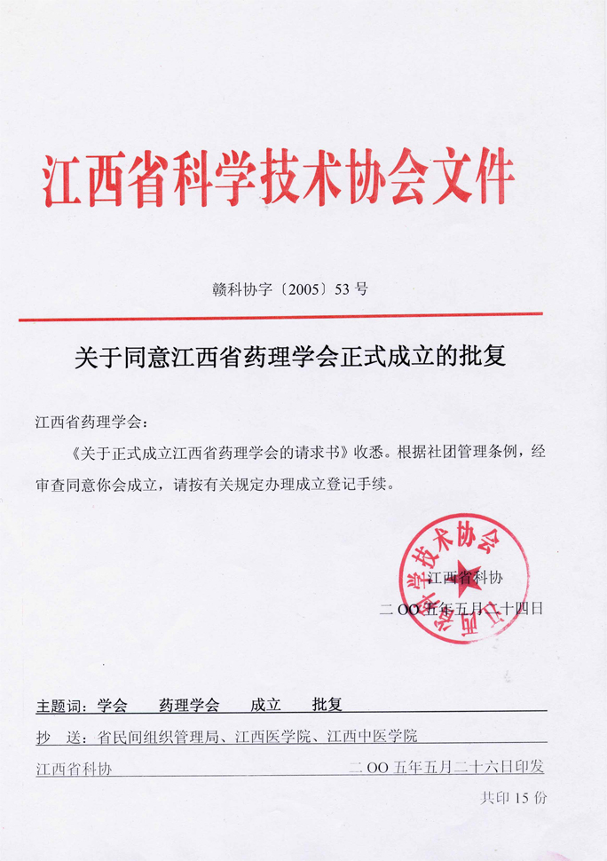 经江西省科协赣科协字[2005]53号文批复同意正式成立江西省药理学会。2005年6月17日江西省民政厅发给赣社证字第722号社会团体法人登记证书。学会办公室设在江西中医学院阳明校区实验大楼606,电话:0791-6825769。