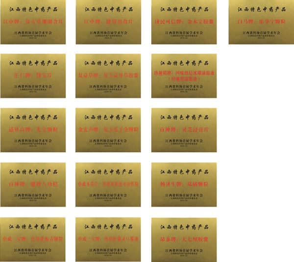大会对评选出:江中牌:复方草珊瑚含片,江中牌:健胃消食片,汇仁牌:肾宝片,济民可信牌:金水宝胶囊,复益草牌:复方益母草胶囊,金宏声牌:复方瓜子金颗粒,适贝高牌:儿宝颗粒,珍视明牌:四味珍层冰硼液眼液(珍视明滴眼液),百神牌:灵芝浸膏片,百神牌:健脾八珍糕,白马牌:乐孕宁颗粒,杨济生牌:双橘颗粒,昂泰牌:大七厘胶囊,中成本草牌:双黄连可溶性粉,中成三宝牌:杆菌灵口服液,中成三宝牌:芪板青颗粒等16个产品颁发“江西特色中药产品”奖牌。十余篇优秀科研论文颁发优秀论文奖状。凡参加听学术报告者可获得继续教育学分。