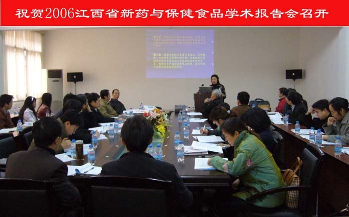 《2006江西省新药与保健食品学术报告会》于2006年12月23日在江西中医学院阳明校区实验大楼三楼会议室成功召开。由江西省药理学会、江西省药学会药事管理专业委员会及药理专业委员会联合举办,参加会议的代表为江西省药理学会常务理事及理事,共有52位常务理事及理事参加了会议。会议由省药理学会理事长陈奇教授、副理事长兼秘书长余日跃教授、副理事长徐彭教授、副理事长何明教授主持。会上发放了学术论文汇编。江西省食品药品监督管理局胡棠红处长、省药品审评中心胡国健副主任、何明教授、陈兰英教授、彭旦明研究员分别作了精彩的学术讲座。