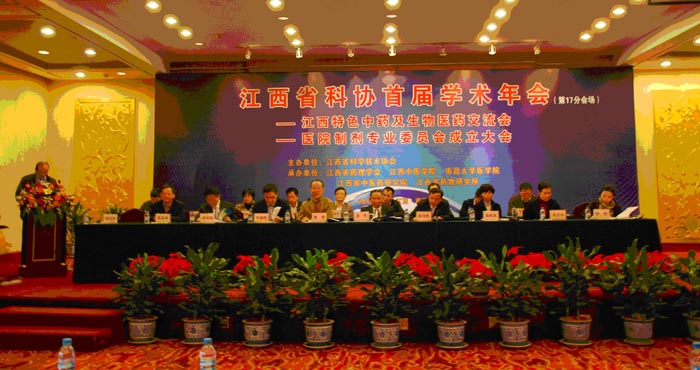 江西省科协首届学术年会-江西特色中药及生物医药交流会暨医院制剂专业委员会成立大会于2010年10月29-30日在南昌市召开。主办单位江西省科学技术协会学会部孙卫民部长、黄丽芬调研员出席,承办单位江西省药理学会正副理事长,江西中医学院副院长朱卫丰教授,南昌大学副校长兼医学院院长辛洪波长江学者特聘教授,江西省中医药研究院院长熊墨年主任药师,江西省药物研究所所长余华主任药师出席。全省各大医院药剂科主任,高等院校及医药单位的教师、研究生及全省中药及生物医药企业领导和研发部及销售部负责人近三百人出席。